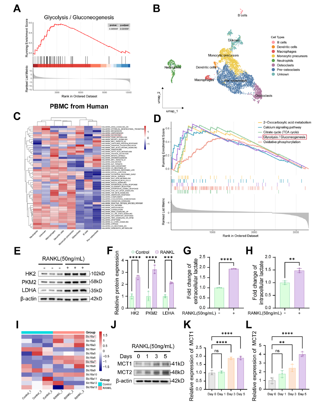 图1:破骨细胞形成过程中糖酵解增强及单羧酸转运体介导的乳酸转运