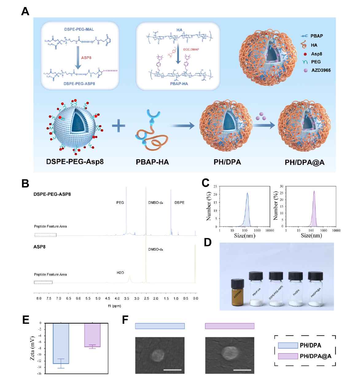 但AZD3965全身给药时面临诸多挑战,不仅骨组织靶向性不足、易引发视网膜损伤等脱靶毒性,还存在水溶性较差的问题,这些都限制了其临床应用。为解决这些难题,研究团队设计并合成了新型纳米载体PH/DPA@A。该载体以生物相容性良好的透明质酸为骨架,结合活性氧响应性苯基硼酸频哪醇酯形成外壳,同时修饰骨亲和性配体DSPE-PEG-Asp8以实现骨靶向递送。表征结果显示,PH/DPA@A平均粒径约179纳米,AZD3965包封率达80.83%,药物负载量为7.35%,在活性氧环境下可快速降解并释放药物,而生理条件下能维持药物稳定。