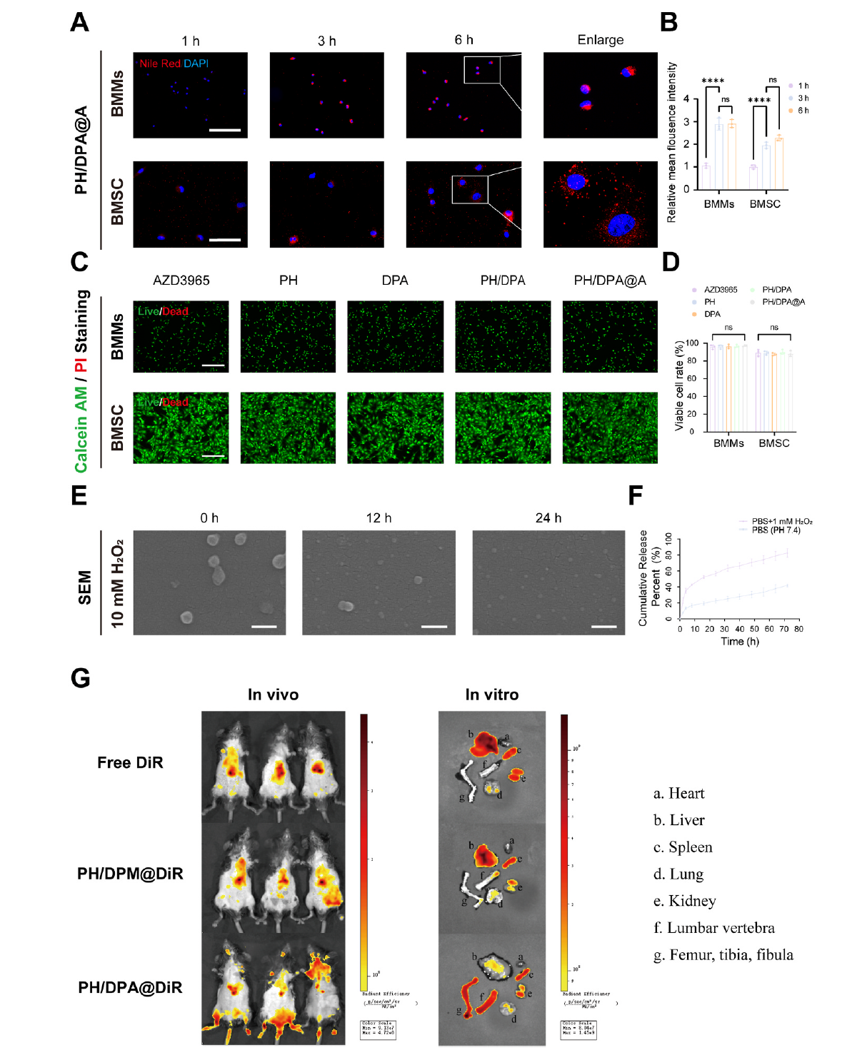 图3:PH/DPA@A的体外细胞摄取、毒性、活性氧响应释放能力及骨靶向递送能力