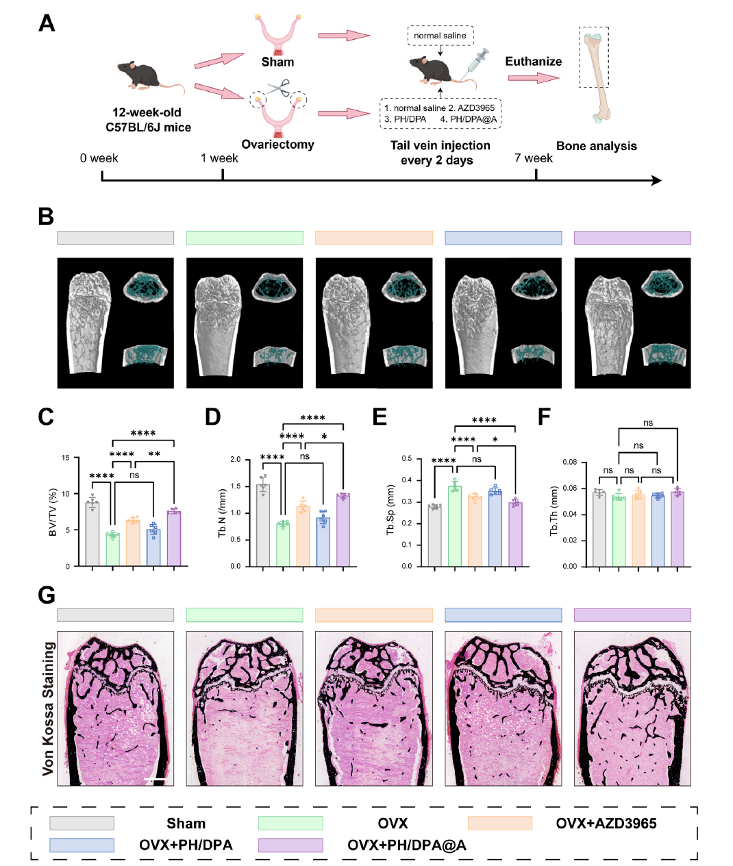 体内实验进一步验证了PH/DPA@A的治疗效果。通过尾静脉注射给药,PH/DPA@A展现出优异的骨靶向能力,在小鼠股骨、胫骨等骨组织中富集明显,而在肝、肾等非靶器官中分布较少。对去卵巢骨质疏松模型小鼠的治疗结果显示,连续6周给药后,PH/DPA@A处理组小鼠股骨骨矿物质密度显著升高,骨体积/组织体积、骨小梁数量及厚度明显增加,骨小梁分离度降低,骨微结构得到有效改善。