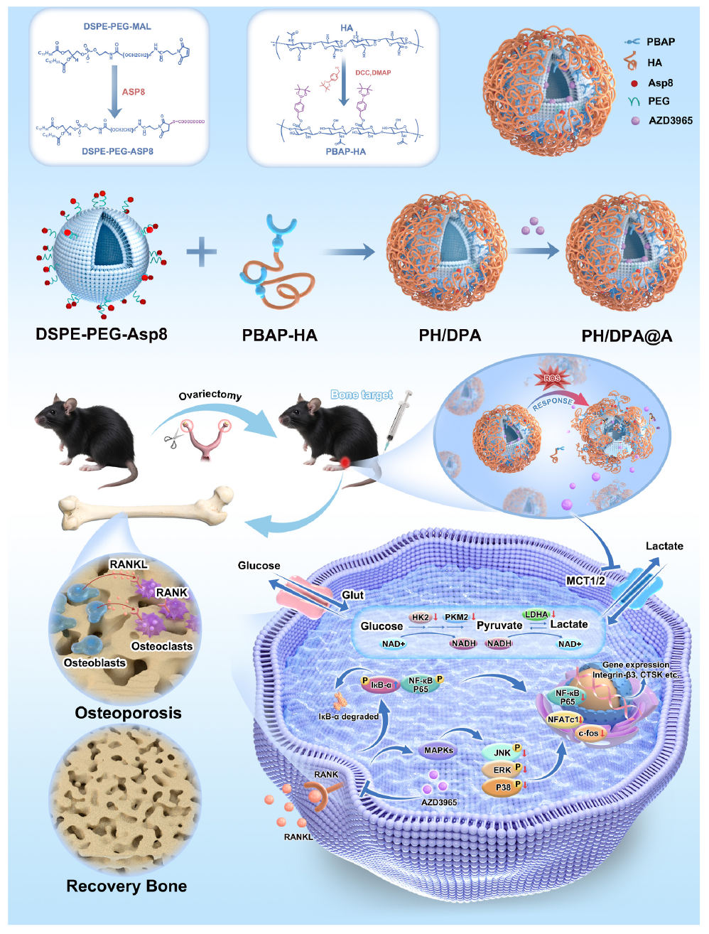 研究构建了骨靶向、ROS响应的纳米载体PH/DPA@A装载AZD3965,精准靶向病变骨组织,阻断乳酸转运抑制破骨细胞糖酵解,改善去卵巢小鼠骨流失,为绝经后骨质疏松提供新疗法。