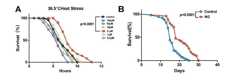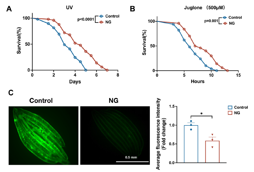 应激抵抗能力是衡量衰老的重要指标,研究团队进一步测试了新芒果苷对线虫应对极端环境的影响:在36.5℃高温、120mJ/cm²紫外线照射,以及藤黄菌素诱导的氧化环境中,新芒果苷处理组线虫的存活率均显著高于对照组。其中,紫外线应激下处理组平均寿命延长24.6%,氧化应激下延长21.4%。深入检测发现,处理组线虫体内的活性氧(ROS)水平明显降低——活性氧过量会造成细胞氧化损伤,加速衰老,这说明新芒果苷是通过增强线虫的抗氧化防御能力,帮助其抵御外界应激。
