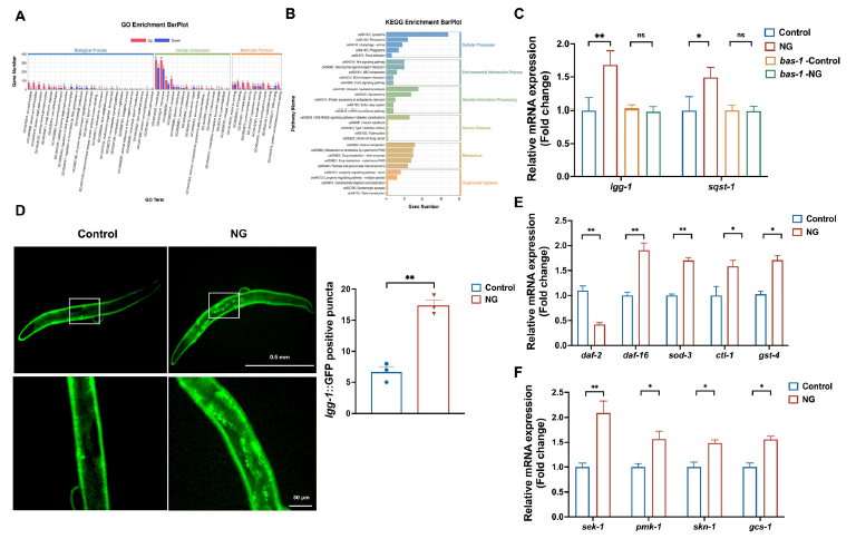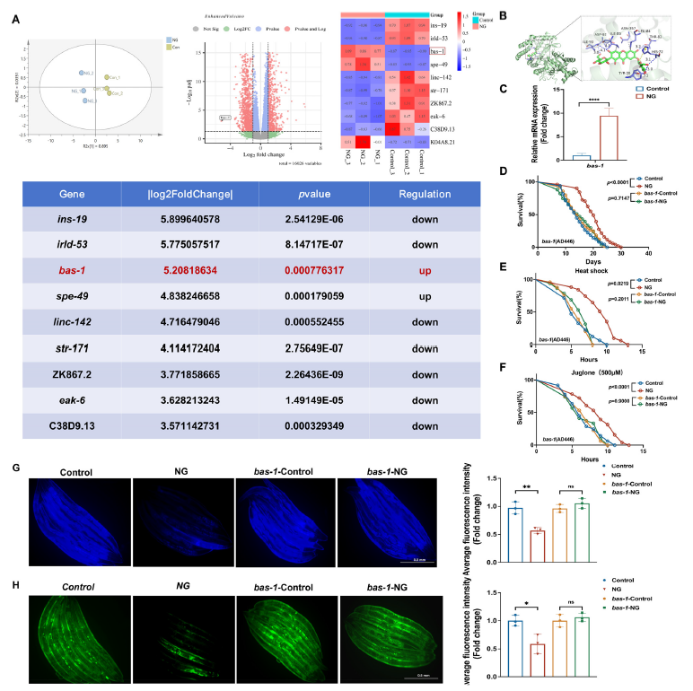 团队还通过基因敲除实验验证通路关系:敲除daf-16或skn-1后,新芒果苷无法激活自噬通路,也不能延长线虫寿命;而bas-1突变后,三条通路均无法被激活——这表明bas-1是调控这三条抗衰通路的上游节点,新芒果苷需通过bas-1才能启动后续抗衰机制。