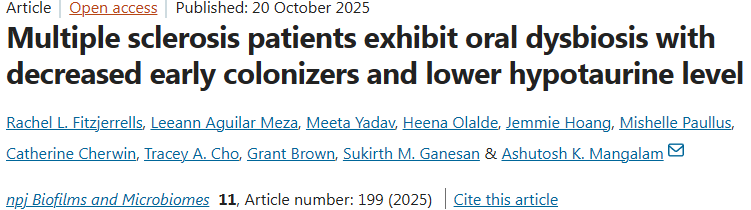 Rachel L. Fitzjerrells et al, Multiple sclerosis patients exhibit oral dysbiosis with decreased early colonizers and lower hypotaurine level, npj Biofilms and Microbiomes (2025). DOI: 10.1038/s41522-025-00787-7.