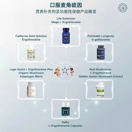 其次是在补剂大国美国,生物技术公司 Blue California 与 Lonza Group 通过精密发酵工艺大规模制造高纯度麦角硫因原料。在终端产品方面,美国品牌 Life Extension 推出含麦角硫因的口服胶囊,每粒含 5 毫克,主打抗氧化与能量代谢调节功能。