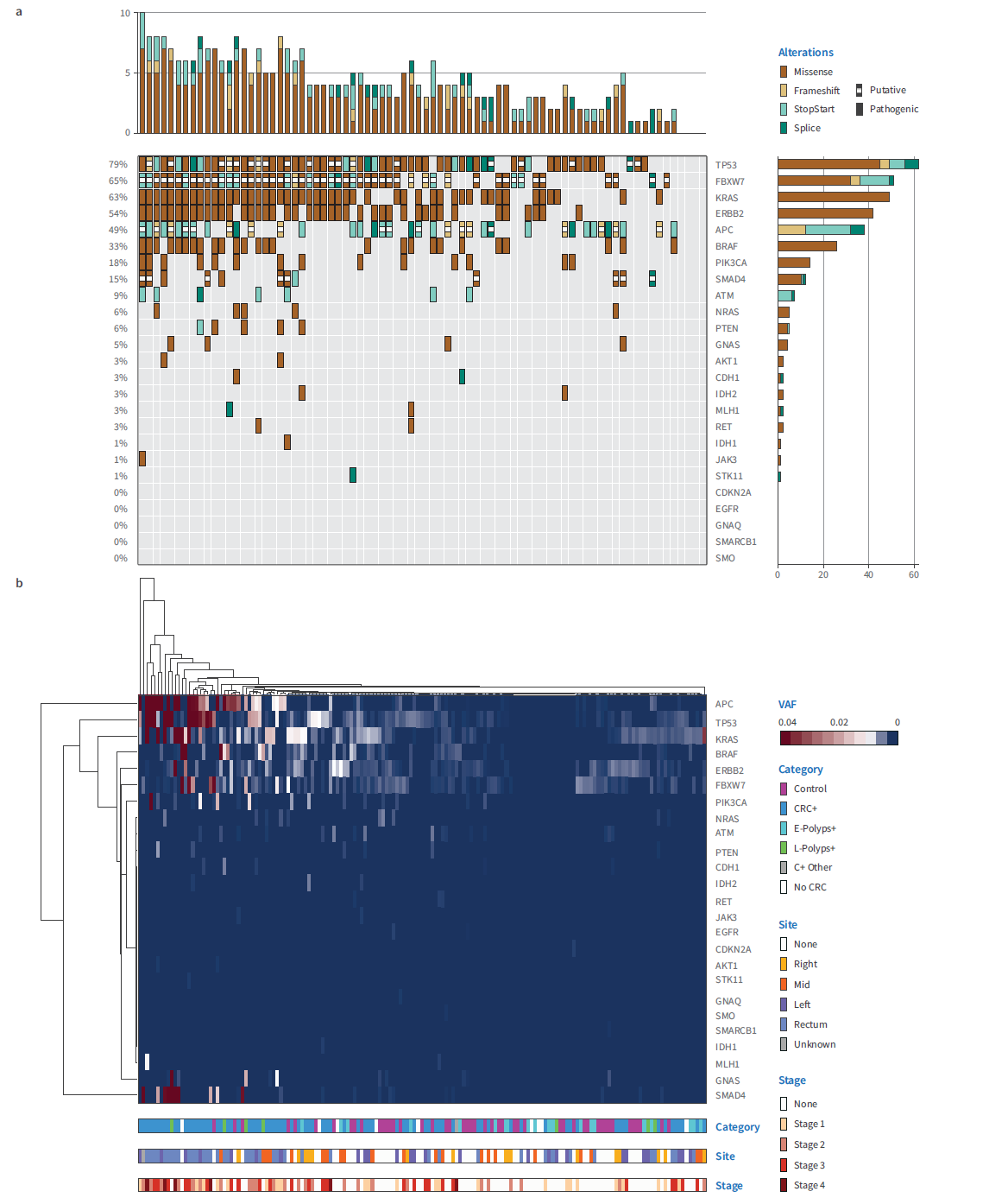 遗传突变分析带来了明确发现,结直肠癌患者直肠黏液中存在清晰的致病基因特征,TP53、FBXW7、KRAS等25个癌相关基因的致病性变异频率与肿瘤组织高度吻合,相关系数高达0.91。其中TP53突变率达79%,FBXW7为65%,KRAS为63%,这些基因突变的最大变异等位基因频率与病变部位密切相关,直肠及左半结肠病变的信号强度显著高于右半结肠,为不同部位结直肠癌的精准分层提供了可靠依据。