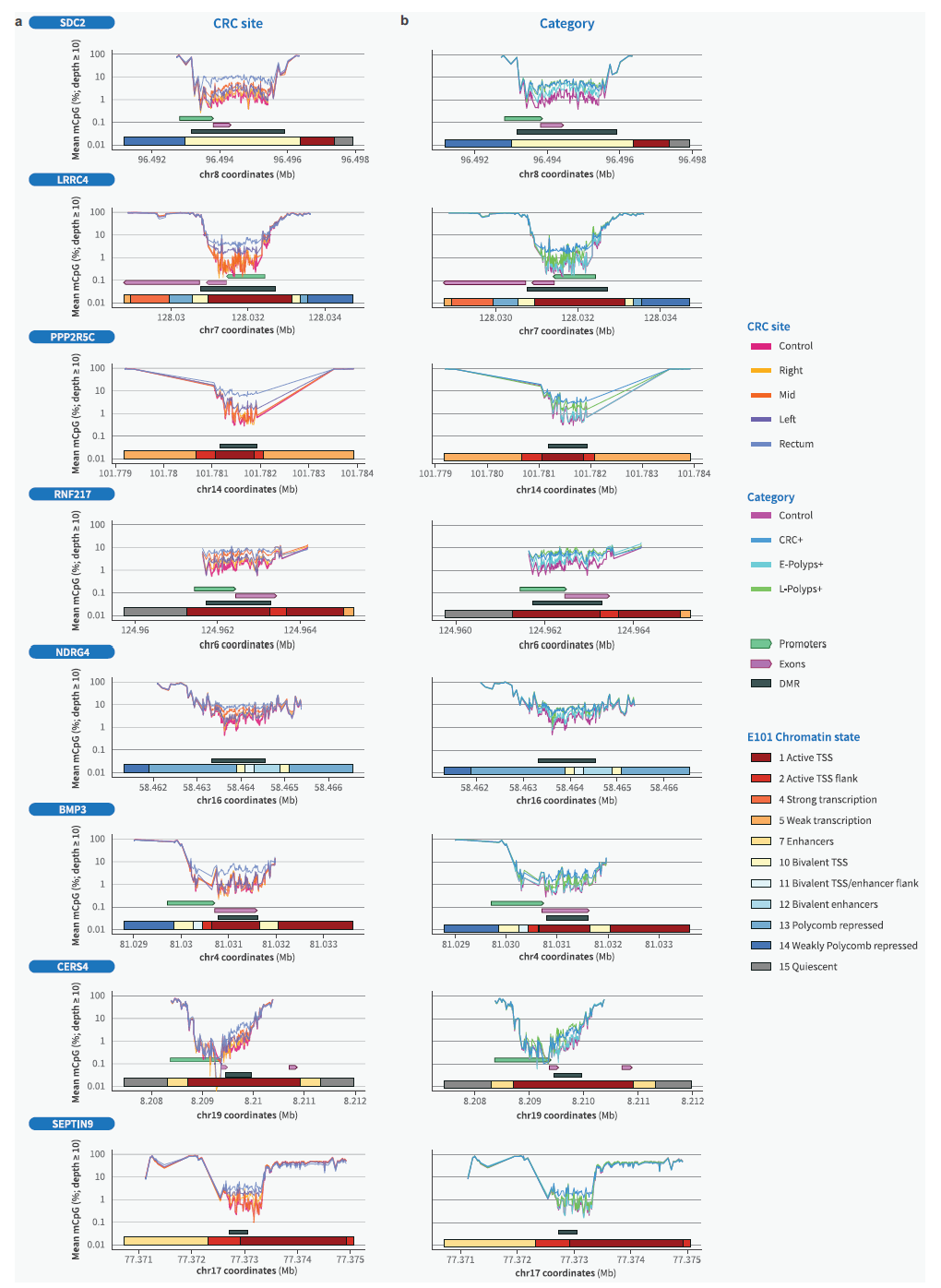 表观遗传层面的探索同样收获颇丰,结直肠癌患者直肠黏液中存在905个高甲基化CpG位点和41个低甲基化CpG位点,这些位点主要富集在基因启动子、5′端非编码区及CpG岛区域,与直肠黏膜参考表观基因组中具有转录活性或二价染色质标记的区域高度重叠。SDC2、LRRC4、PPP2R5C等基因的高甲基化特征不仅与结直肠癌分期相关,还能有效区分早期息肉、晚期息肉与癌症组织,其中晚期息肉的甲基化模式与结直肠癌更为接近,清晰呈现出癌前病变的分子特征。