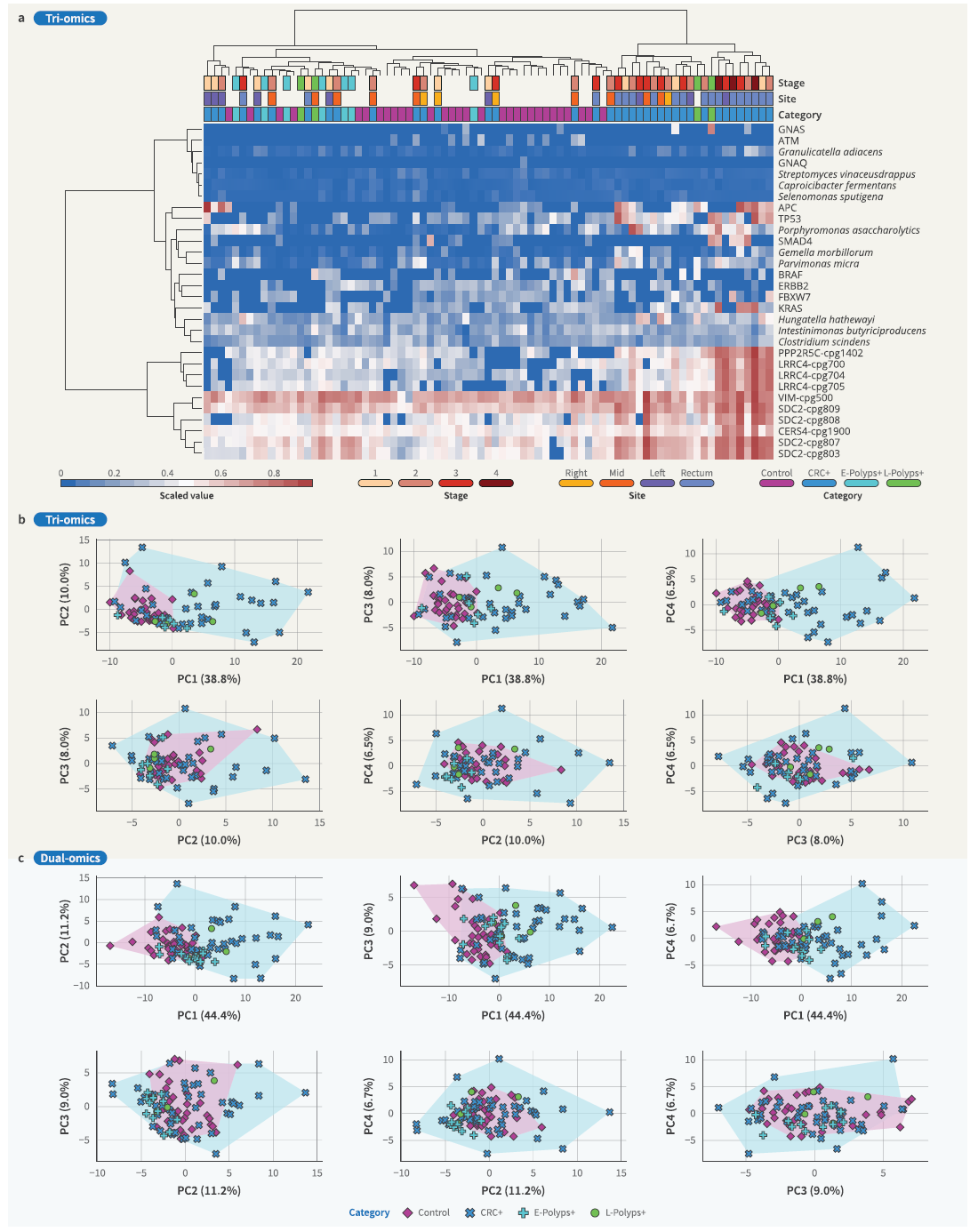 更值得关注的是,研究团队将宿主遗传变异、DNA甲基化和微生物组数据进行宏基因组整合分析,大幅提升了诊断精准度。主成分分析显示,整合方法可有效区分不同病变阶段和部位的结直肠癌,其中DNA甲基化特征是驱动分组的主要因素,基因突变和微生物组特征提供补充鉴别信息,三者协同实现对结直肠癌及癌前病变的精准分层,其性能远超任何单一组学分析。