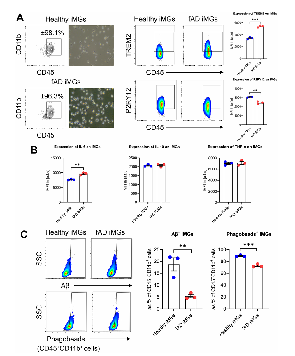 进一步观察诱导小胶质细胞样细胞特性,分化40天后,健康组和家族性阿尔茨海默病组的细胞均高表达CD45、CD11b等谱系标志物,阳性率分别达98.1%和96.3%。形态上,家族性阿尔茨海默病组的细胞更多呈现阿米巴样,健康组则以细长分支的静息态为主;分子层面,家族性阿尔茨海默病组的疾病相关小胶质细胞标志物TREM2表达显著升高,稳态标志物P2RY12表达明显降低,同时促炎细胞因子IL-6分泌增加,而对β淀粉样蛋白和微球的吞噬能力,比健康组显著下降,这些特征与疾病状态下小胶质细胞的异常表现高度吻合。