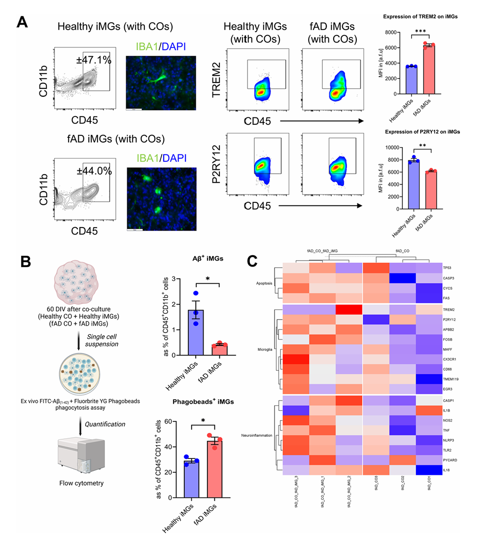 当两种细胞共培养形成神经免疫组装体后,诱导小胶质细胞样细胞成功融入脑类器官,且家族性阿尔茨海默病组的细胞仍保持高TREM2、低P2RY12的活化特征——对β淀粉样蛋白的吞噬能力比健康组装体组低,对微球的吞噬能力却有所上升。转录组分析更揭示,加入诱导小胶质细胞样细胞的家族性阿尔茨海默病脑类器官,基因表达模式与人类阿尔茨海默病患者更接近,还富集了TREM2、CX3CR1等小胶质细胞特异性标志物,以及神经炎症相关基因,说明组装体的转录组特征更贴合真实疾病。