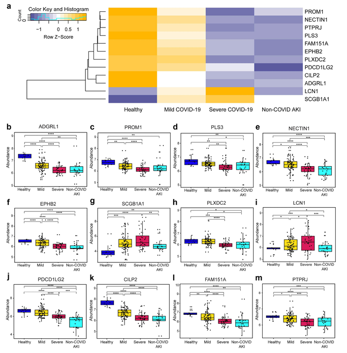 这项研究纳入了130名新冠住院患者、26名非新冠急性肾损伤患者,还有13名健康对照者,样本来自美国西奈山医院和密歇根大学医学院。研究者们把尿液蛋白质组学、血浆蛋白质组学、尿液沉积物单细胞转录组学数据整合到一起,还用到了诱导多能干细胞衍生的肾类器官体外模型,从机制解析到验证都做得很全面。通过定量串联质谱标签蛋白质组学分析,他们一共鉴定出34474种独特肽段,对应6196种尿蛋白,清晰区分出了重症和轻症新冠患者的蛋白表达差异。