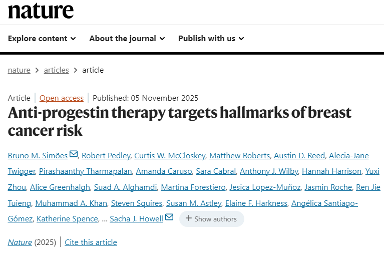 Simões, B.M., Pedley, R., McCloskey, C.W. et al. Anti-progestin therapy targets hallmarks of breast cancer risk. Nature (2025). doi:10.1038/s41586-025-09684-7