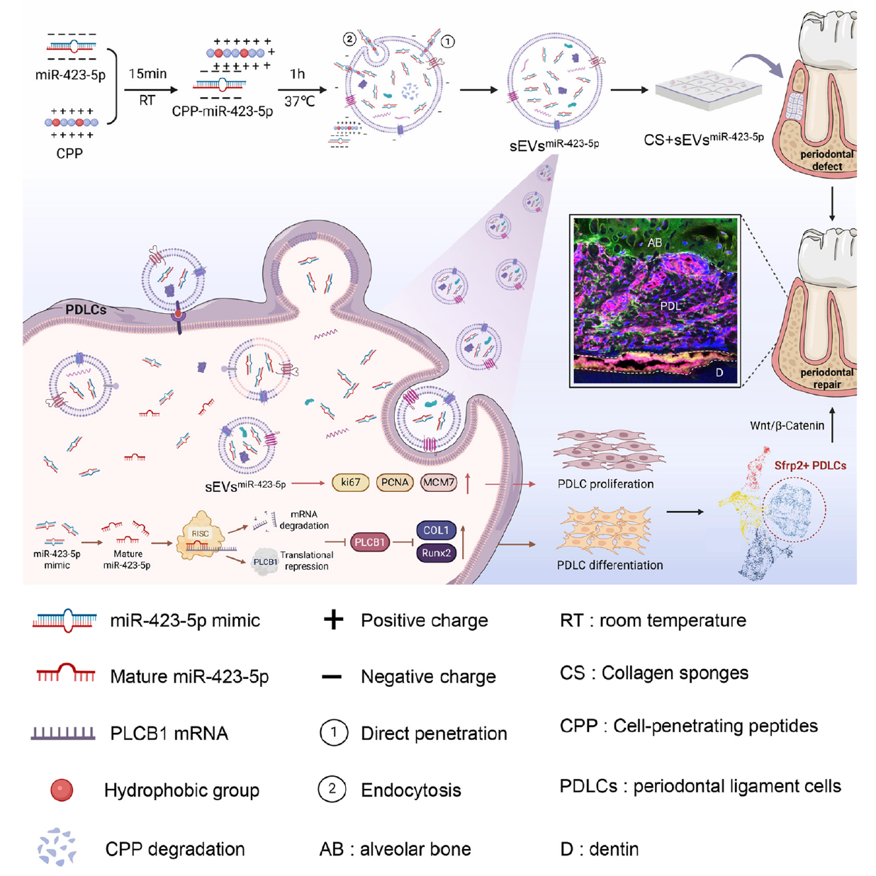 本研究发现miR-423-5p是小细胞外囊泡中促进牙周膜细胞成骨分化的关键成分,工程化富集该分子的囊泡可靶向PLCB1、扩增Sfrp2+成骨成纤维细胞,高效推动牙周再生,为牙周炎治疗提供新策略。