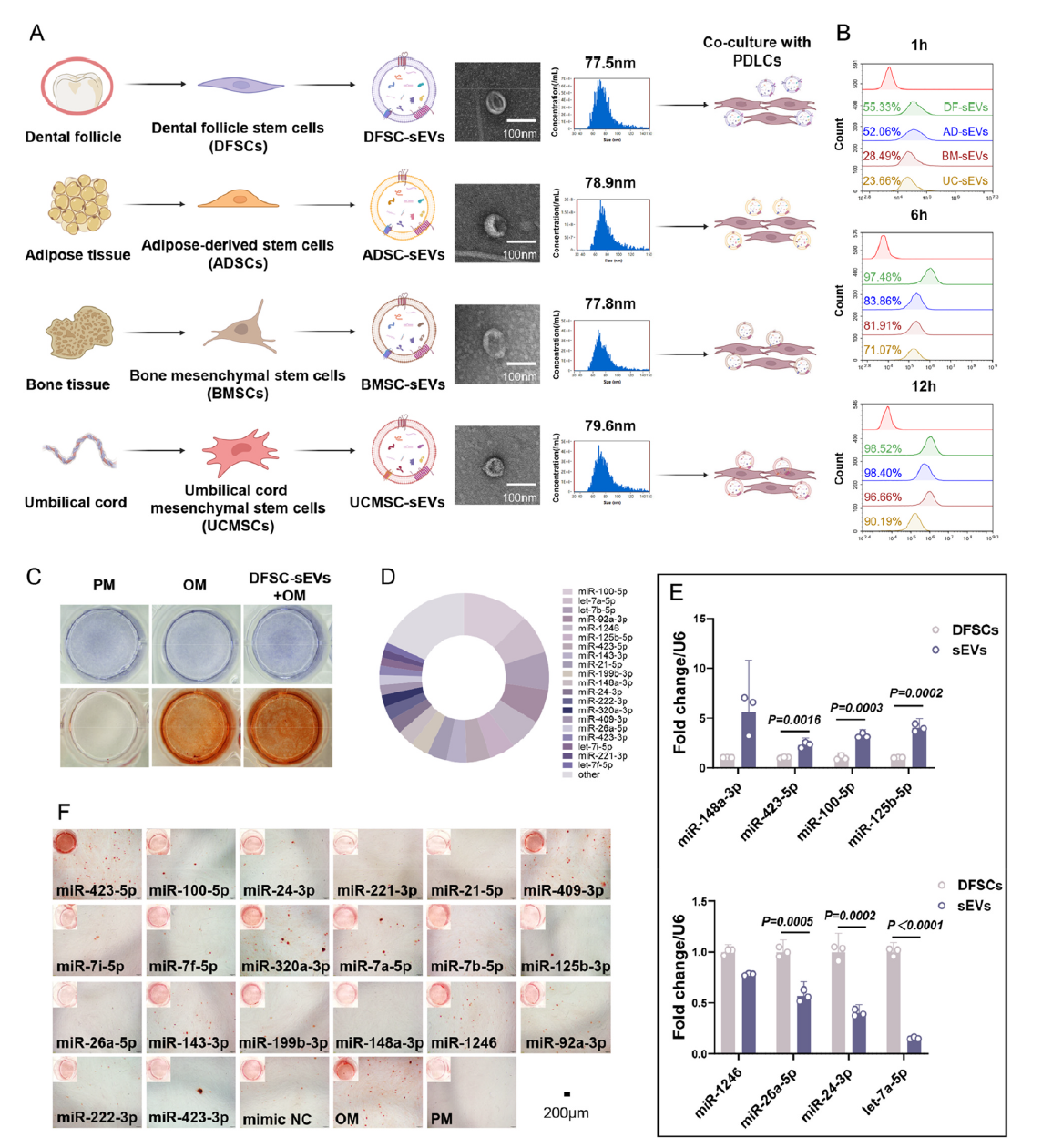 研究团队首先对多种干细胞来源的小细胞外囊泡展开筛选,涵盖脂肪间充质干细胞、骨髓间充质干细胞、脐带间充质干细胞及牙囊干细胞。结果显示,牙囊干细胞来源的小细胞外囊泡(DFSC-sEVs)表现最为突出,不仅能被牙周膜细胞快速识别并摄取,还能显著提升细胞碱性磷酸酶活性,促进矿化结节形成,成为后续研究的核心载体。