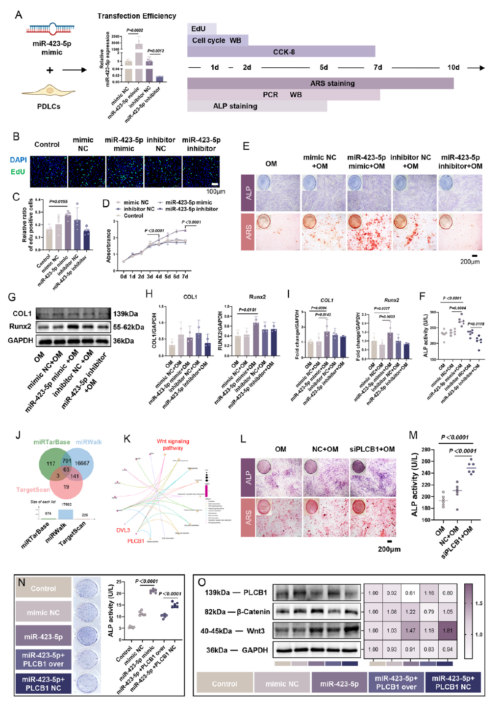 miR-423-5p的作用机制也得到清晰解析。通过靶基因预测与验证,研究人员发现它能直接靶向磷脂酶Cβ1(PLCB1)。抑制PLCB1可激活经典Wnt/β-连环蛋白信号通路,进而加速牙周膜细胞成骨分化,而PLCB1过表达则会逆转miR-423-5p的成骨促进效应,这一明确的靶向调控轴为工程化改造提供了精准靶点。