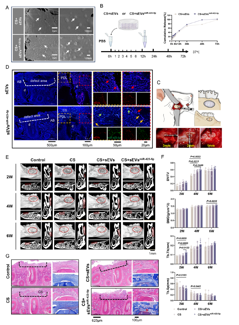 在大鼠牙周缺损模型中,研究团队将负载sEVsmiR-423-5p的胶原海绵植入缺损部位。胶原海绵作为生物相容性优良的载体,实现了囊泡的局部持续释放,72小时内即可完成有效载荷的全面释放。术后2周,sEVsmiR-423-5p组便出现连续板层骨形成;4周时缺损闭合率显著提升;6周时再生骨密度已与周围正常骨组织接近,且形成了类似天然牙骨质-牙周膜-牙槽骨的复合结构,再生效果全面优于其他实验组。