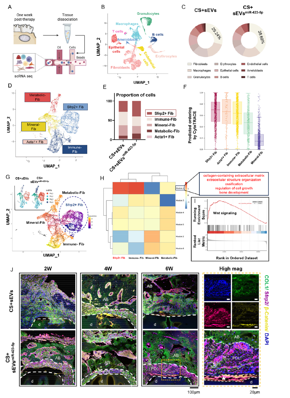 图6 富集miR-423-5p的工程化小细胞外囊泡介导的牙周再生涉及Sfrp2+成纤维细胞扩增