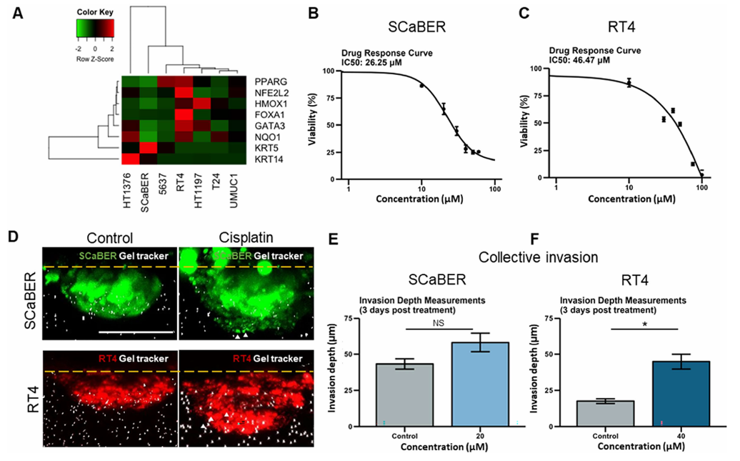 为验证平台可靠性,研究团队先从膀胱癌细胞系入手。他们选取了临床中最常见的两种亚型:基底型(SCaBER)和管腔型(RT4)。分子检测显示,SCaBER高表达KRT5、KRT14等基底标志物,而RT4不仅强表达PPARG、FOXA1等管腔标志物,还因NRF2水平较高而自带化疗耐药倾向。药物反应实验证实了这一点:SCaBER对顺铂更敏感,半数抑制浓度(IC₅₀)仅26.25μM;RT4则表现出明显耐药,IC₅₀达46.47μM。更关键的侵袭性分析发现,顺铂处理后,RT4细胞的侵袭深度几乎翻倍,而SCaBER仅在高浓度顺铂下呈现轻微侵袭增强趋势,这一结果清晰证明,平台能精准区分不同亚型细胞对化疗的反应差异。