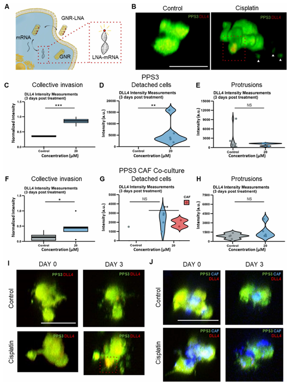 在分子机制层面,研究找到了关键的“侵袭信号”DLL4。作为侵袭性“领导细胞”的标志性分子,DLL4的表达变化能直接反映肿瘤侵袭状态。通过纳米生物传感器检测发现,顺铂处理后,微肿瘤侵袭前沿的细胞、以及脱落的单个癌细胞中,DLL4表达均显著升高;且在有侵袭性的样本(如PPS2)中,这种升高更明显。时间序列观察还发现,DLL4的表达具有动态性:当它的水平下降时,原本延伸出的肿瘤突起会逐渐回缩,这意味着DLL4不仅可作为评估侵袭风险的标志物,还可能成为干预靶点。