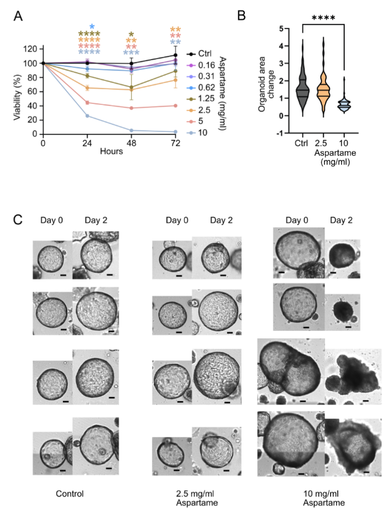 研究团队用Caco-2肠道上皮细胞、人肠道类器官和肠道芯片这三种模型,模拟了日常食用剂量(1-10 mg/mL)的阿斯巴甜影响。结果发现,阿斯巴甜的毒性比想象中更强,浓度低至0.625 mg/mL就会让肠道上皮细胞活力下降,还能破坏人肠道类器官的三维结构,让原本完整的类器官收缩、失去管腔。