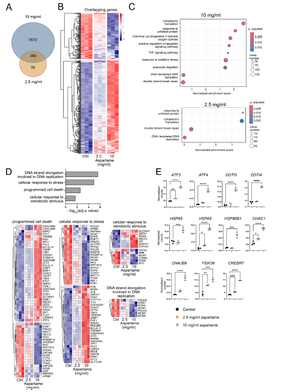 除了直接杀伤细胞,阿斯巴甜还会在基因层面捣乱。通过转录组测序,研究团队发现,2.5 mg/mL和10 mg/mL的阿斯巴甜分别让肠道芯片模型里399个、8272个基因的表达发生显著改变,且两种浓度下有超过90%的差异基因重叠,还呈现剂量越高、变化越明显的规律。这些基因主要集中在两个方向:一方面是未折叠蛋白反应、氧化应激、细胞凋亡、TNF炎症通路等应激通路被激活;另一方面是DNA修复、DNA复制相关通路被抑制,意味着肠道细胞不仅在受苦,还失去了自我修复的能力。