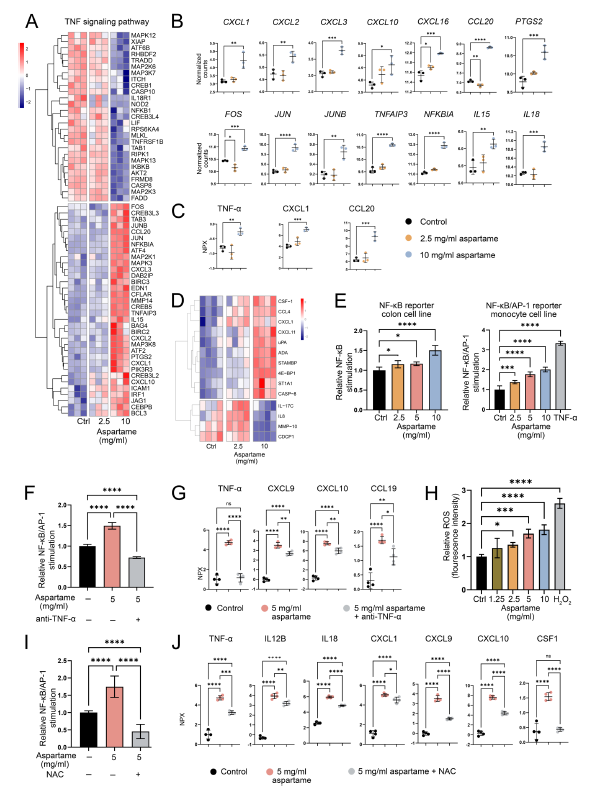 炎症反应也是阿斯巴甜伤害肠道的重要手段。研究证实,阿斯巴甜会激活NF-κB通路,这个通路是炎症反应的开关,一旦激活就会引发级联反应。进一步实验发现,这种激活依赖氧化应激:用抗氧化剂N-乙酰半胱氨酸(NAC)处理后,NF-κB的激活程度明显下降。同时,阿斯巴甜还会让TNF信号通路相关基因上调,诱导CXCL1、CXCL10、CCL20等趋化因子,以及IL15、IL18等细胞因子释放,这些物质会招募中性粒细胞、淋巴细胞等免疫细胞到肠道,加剧炎症。更重要的是,中和TNF-α或抑制NF-κB通路后,阿斯巴甜的细胞毒性会有所降低,说明炎症确实是它伤人的关键环节。