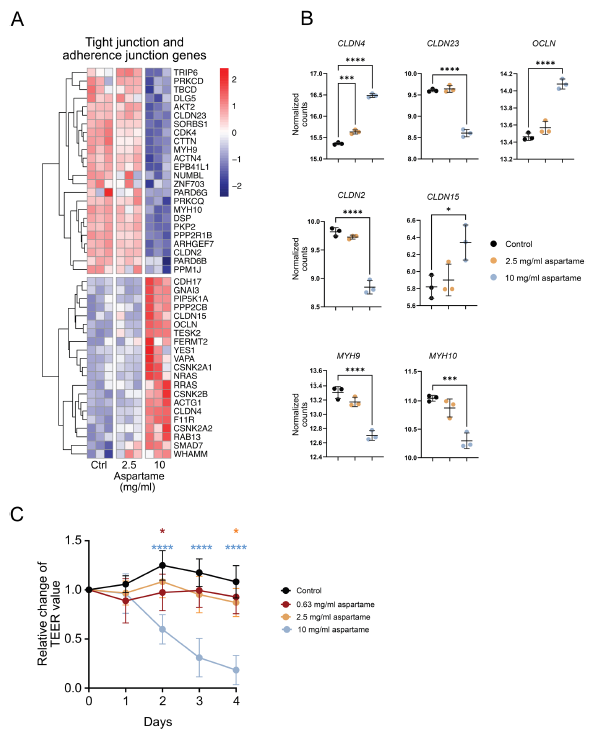 肠道的保护墙——上皮屏障,也逃不过阿斯巴甜的破坏。研究发现,阿斯巴甜会影响紧密连接和黏附连接相关基因(比如CLDN家族、OCLN、MYH9)的表达;在肠道芯片模型里,它还会剂量依赖性破坏屏障完整性:10 mg/mL浓度下第2天就会让屏障受损,2.5 mg/mL浓度下第4天也会出现明显损伤。免疫荧光染色还显示,阿斯巴甜会打乱肠道类器官中ZO-1和闭合蛋白的三维组装结构,让肠道的防御缺口变大。