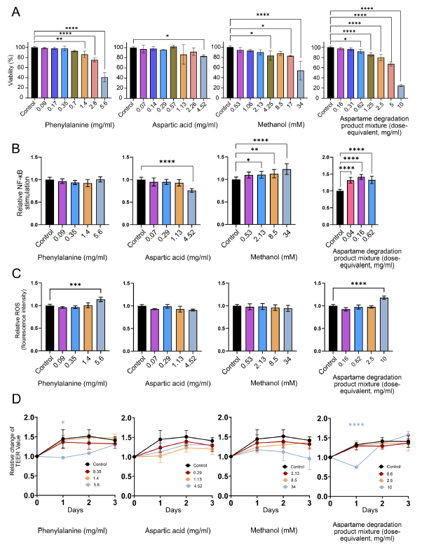 更值得警惕的是阿斯巴甜的降解产物。阿斯巴甜在人体内会分解成苯丙氨酸、天冬氨酸和甲醇,研究发现这三种物质单独使用时,只有高浓度才会有毒性;但混合后,在低至0.62 mg/mL阿斯巴甜等效剂量下就会显著杀伤细胞,还能诱导NF-κB激活、ROS生成和屏障损伤,这说明降解产物可能会“联手”放大阿斯巴甜的毒性。