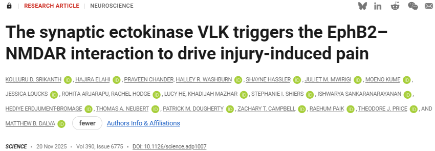 Kolluru D. Srikanth et al, The synaptic ectokinase VLK triggers the EphB2–NMDAR interaction to drive injury-induced pain, Science (2025). DOI: 10.1126/science.adp1007.