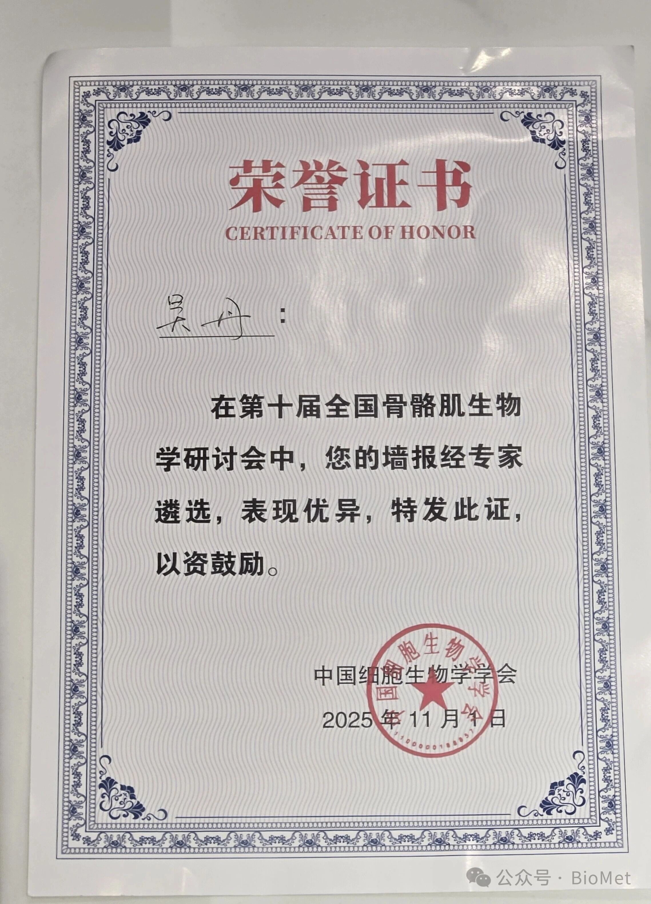经过大会专家委员会的严格遴选和评审,吴丹同学的墙报以其前沿的科学问题、严谨的实验设计、详实的数据和清晰的视觉呈现,获得了评委们的一致好评,最终斩获“最佳墙报奖”。这份荣誉不仅是对吴丹同学个人科研能力的肯定,更是对我们团队(广东省科学院微生物研究所,华南应用微生物国家重点实验室)在骨骼肌研究领域持续深耕和创新精神的认可。