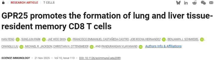 Science子刊:新研究发现GPR25促进肺部和肝组织驻留记忆CD8 T细胞的形成