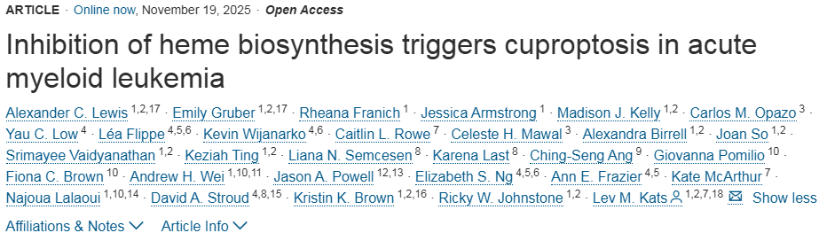 "我们揭示了AML细胞的一个根本弱点,"彼得麦克博士后研究员Alexander Lewis博士表示。"通过阻止AML细胞产生血红素,我们可以激活铜死亡机制,这是一种独特的细胞死亡形式,能有效杀死那些最可能导致癌症复发的细胞。这为开发潜在更强大、更持久的疗法打开了大门。"