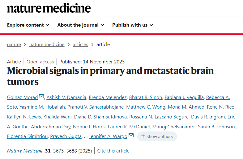 Morad, G., Damania, A.V., Melendez, B. et al. Microbial signals in primary and metastatic brain tumors. Nat Med 31, 3675–3688 (2025). doi:10.1038/s41591-025-03957-4