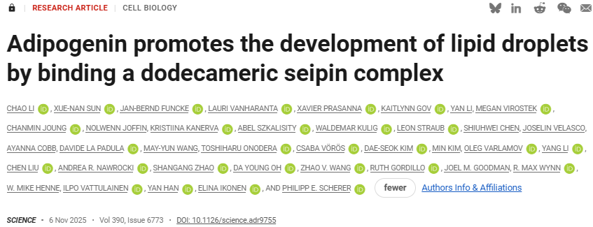 Chao Li et al, Adipogenin promotes the development of lipid droplets by binding a dodecameric seipin complex, Science (2025). DOI: 10.1126/science.adr9755.