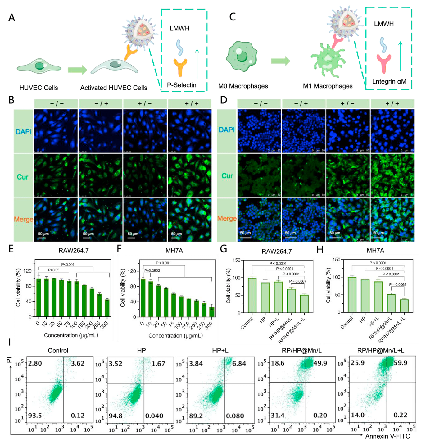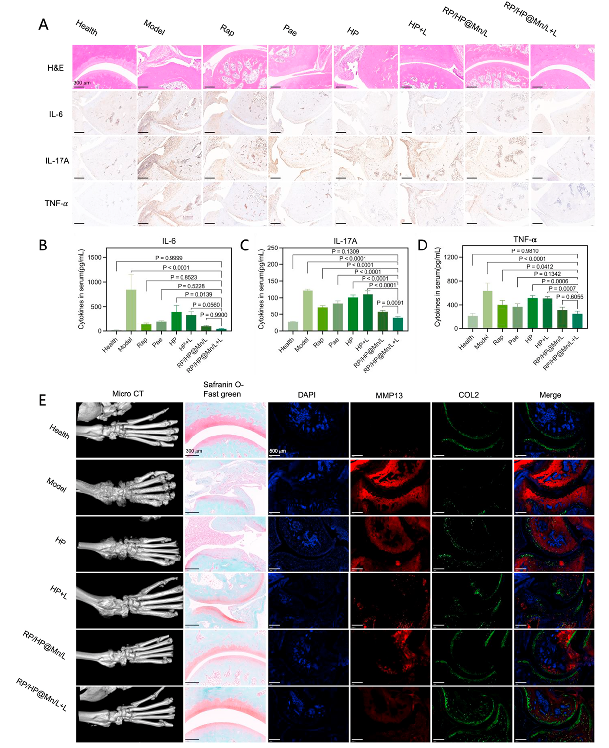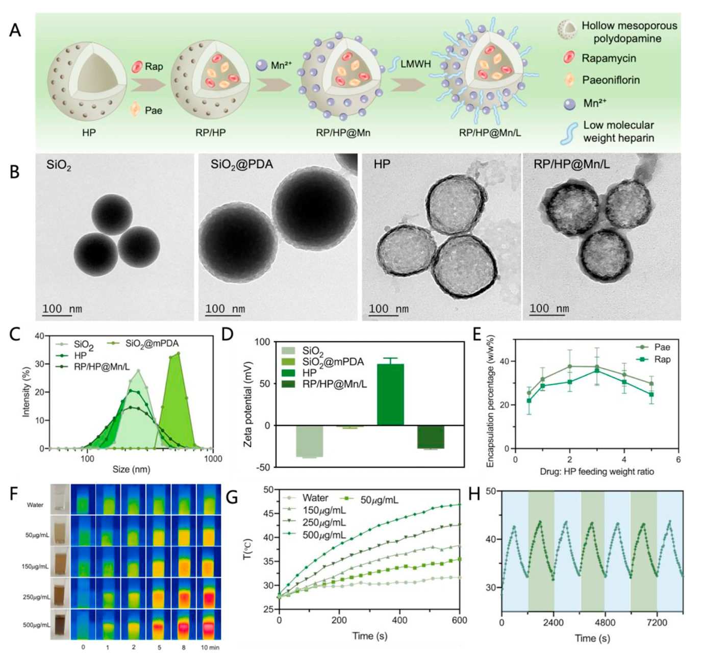 这款名为RP/HP@Mn/L的纳米胶囊,是针对关节炎症的精准治疗系统。它以低分子量肝素修饰的锰离子掺杂空心介孔聚多巴胺为载体,同时搭载雷帕霉素与芍药苷两种作用互补的药物。表征数据显示,这款纳米胶囊形态均一,水合粒径约225.43±8.64 nm,刚好能穿透炎症关节的血管壁,在模拟生理环境下稳定性优异,能确保药物顺利到达病灶。