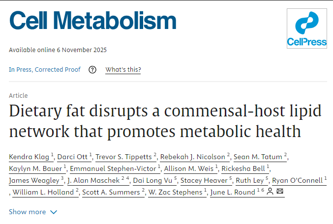 Kendra Klag,Darci Ott,Trevor S.Tippetts,et al. Dietary fat disrupts a commensal-host lipid network that promotes metabolic health, Cell Metabolism (2025). DOI:10.1016/j.cmet.2025.10.007