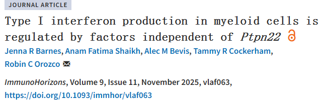 Jenna R Barnes et al, Type I interferon production in myeloid cells is regulated by factors independent ofPtpn22, ImmunoHorizons (2025). DOI: 10.1093/immhor/vlaf063.