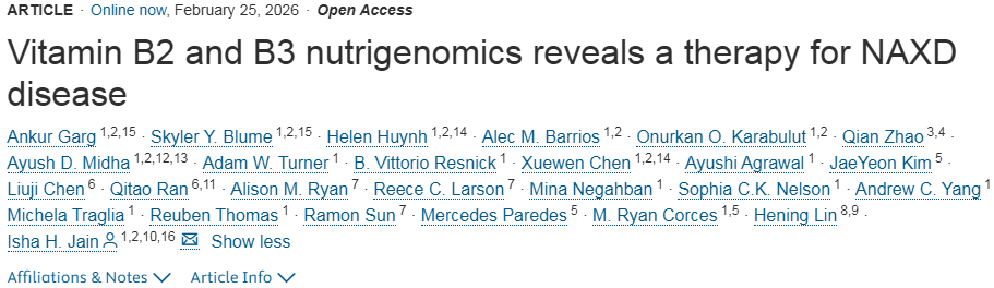 Ankur Garg et al, Vitamin B2 and B3 nutrigenomics reveals a therapy for NAXD disease, Cell (2026). DOI: 10.1016/j.cell.2026.01.022.