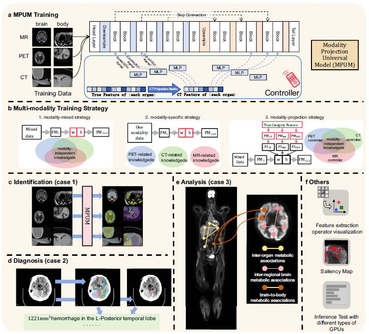 该模型以861名受试者的影像数据为基础完成训练,借助模态投影策略能动态适配不同成像模态的特征差异:不仅实现当前最优的全身体器官分割效果,为计算机辅助诊断提供快速解剖定位与精准量化支持,还通过基于控制器的卷积层实现显著图可视化,让模型在临床应用中的可解释性大幅提升。更重要的是,MPUM还能揭示脑-体轴及不同脑区间的代谢关联,从全身体视角为系统生理交互研究提供关键新方向。