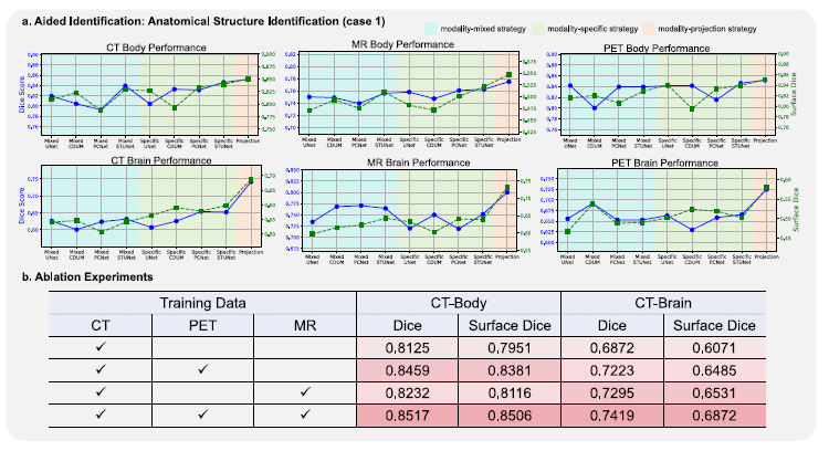 为验证MPUM的临床价值与科研潜力,研究团队设计了三大核心案例。在解剖结构识别任务中,研究将MPUM与CDUM、PCNet、STUNet等主流通用分割模型,以及调整参数后的3D UNet进行对比,并测试了模态混合、模态特异性及模态投影三种训练策略。结果显示,模态投影策略在所有任务中表现最优:MRI身体分割的Dice系数达0.7751、表面Dice系数为0.5471,CT脑部分割的Dice系数达0.7419,均显著优于其他两种策略。在单一器官分析中,MPUM在超过60个器官的分割上取得统计学意义的显著提升,尤其对血管、肌肉骨骼区域及腹部小器官等难分割结构,优势更为明显。