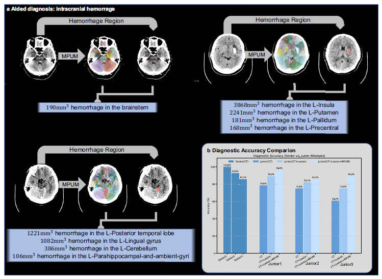 在颅内出血这一危及生命的急症诊断中,快速精准识别直接影响患者预后。研究团队先在Instance2022数据集上对MPUM进行微调,使其能从CT头部扫描中精准检测并量化出血区域——比如自主识别出左侧岛叶3868立方毫米的出血灶,以及左侧壳核2241立方毫米的出血灶。后续临床验证中,3名初级放射科医生在借助MPUM提供的病灶掩码和脑区图谱后,诊断准确率从平均约71.4%提升至90.5%,已接近资深放射科医生的水平,有效解决了初级医师常出现的出血区域识别不全、相邻脑区混淆等问题。