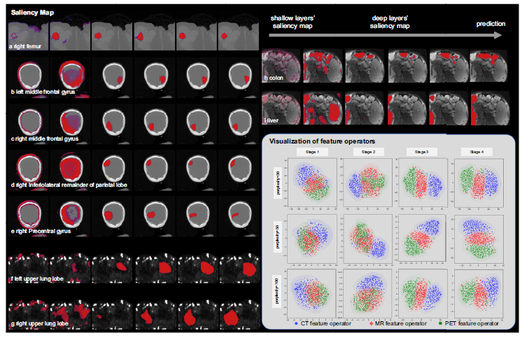 从机制上看,MPUM的浅层网络主要提取边缘、纹理等模态无关的低层次语义特征,深层网络则专注捕捉模态特异性的高层次语义特征;显著图分析进一步显示,浅层网络聚焦影像的轮廓和纹理信息,深层网络则逐步细化感兴趣区域,且CT、MR、PET三种模态的显著图各有侧重——CT图注重轮廓、MR图突出软组织细节、PET图聚焦代谢活性区域,这一特点进一步保障了模型的临床可解释性。