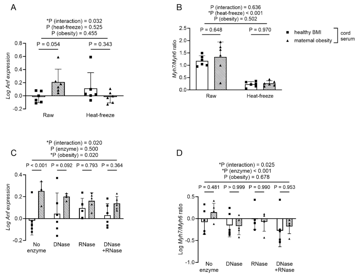 为了找到介导这一效应的关键分子,研究人员对脐带血清进行了热冻循环处理和核酸酶消化实验。结果清晰显示,热冻循环处理后,肥胖孕妇脐带血清上调心房利钠肽基因表达的效应完全消失,而添加脂质体转染试剂后该效应又能恢复;同时,DNase或RNase单独处理,或是两者联合处理,都能彻底阻断脐带血清对心肌细胞相关基因的调控作用。这一发现明确提示,血清中的核酸类物质,很可能是结合于外泌体或载体蛋白的微小RNA,是触发心肌细胞病理改变的核心介导因子。