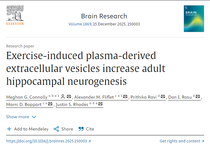 Meghan G. Connolly,Alexander M. Fliflet,Prithika Ravi, et al. Exercise-induced plasma-derived extracellular vesicles increase adult hippocampal neurogenesis, Brain Research (2025). DOI:10.1016/j.brainres.2025.150003