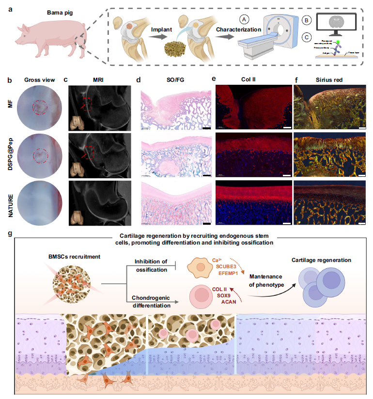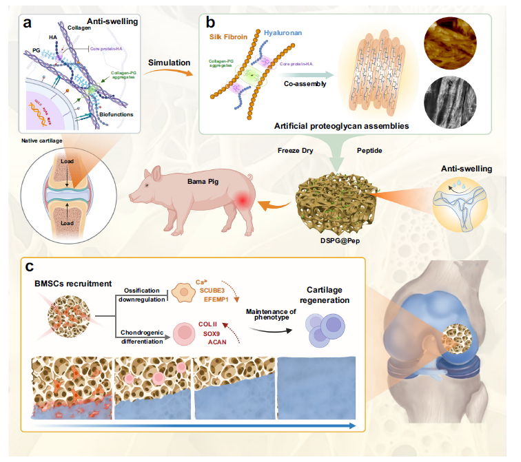 四川大学研究团队研发的抗肿胀自激活人工蛋白聚糖组装体DSPG@Pep,可稳定定植于软骨缺损部位,通过招募内源性干细胞、下调钙信号通路及骨化相关基因,在兔和猪模型中均证实能高效促进微骨折术后透明软骨再生