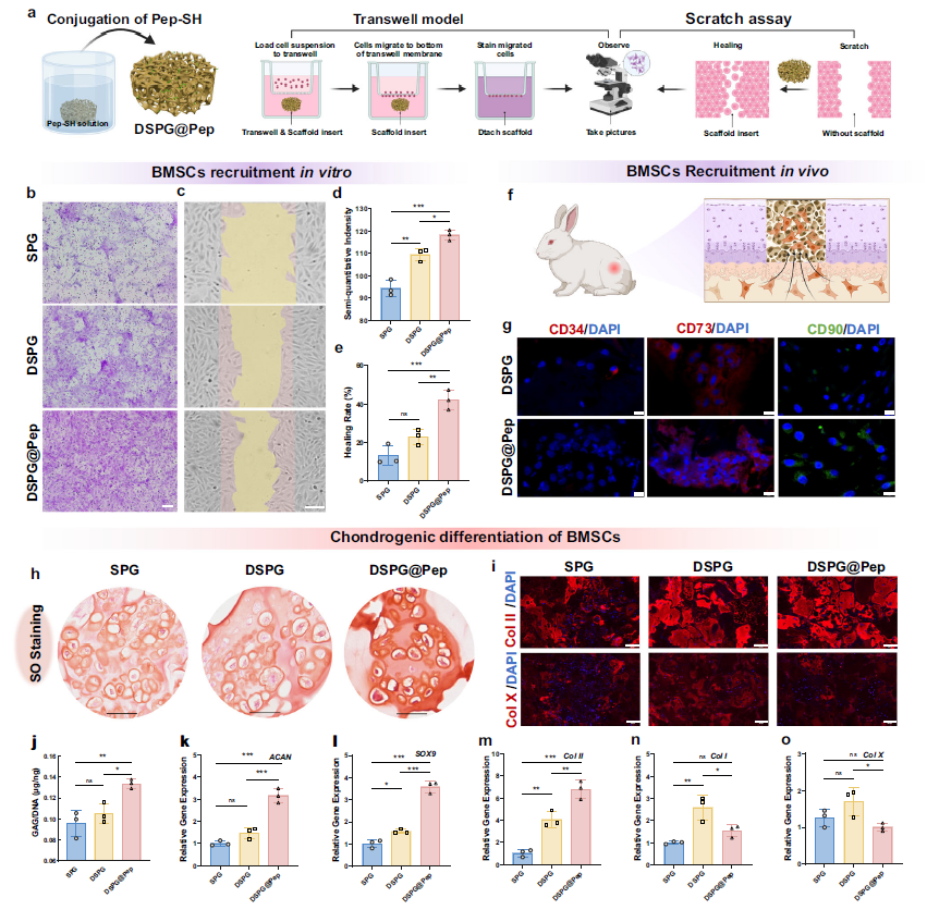生物活性肽的引入并未改变DSPG的微观结构与力学性能,还实现了可持续的肽释放模式:前10天释放20%的肽用于招募细胞,剩余80%残留于支架表面调控细胞分化。体外实验数据证实,DSPG@Pep能显著促进骨髓间充质干细胞的横向与纵向迁移,免疫荧光染色结果显示,它对CD73、CD44、CD90阳性内源性干细胞的招募能力明显优于单纯DSPG。