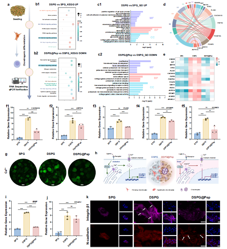 转录组分析结果显示,与SPG相比,DSPG能上调ECM-受体相互作用、钙信号通路及骨化相关基因;而DSPG@Pep则显著下调钙信号通路基因(如CACNA1G、AVPR1A)和骨化相关基因(如EFEMP1、SCUBE3、SPARCL1)。进一步验证实验证实,DSPG会促进调控细胞外钙内流、细胞内钙释放及骨化相关基因的表达,导致胞质钙浓度升高;而DSPG@Pep通过下调这些基因的表达,维持较低的胞质钙浓度,从而抑制骨化基因激活。
