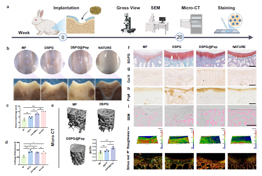 在兔膝关节全层软骨缺损模型中,术后20周DSPG@Pep组的缺损部位完全被新生软骨覆盖,与天然软骨实现完好整合,新生软骨厚度与正常软骨无显著差异,且胶原纤维排列接近天然软骨的垂直取向。Micro-CT检测显示,DSPG@Pep能有效保护软骨下骨结构完整,其骨体积/总体积比值在各组中最高。