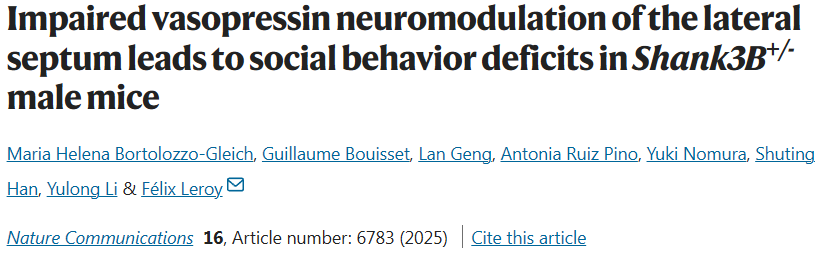 Maria Helena Bortolozzo-Gleich et al, Impaired vasopressin neuromodulation of the lateral septum leads to social behavior deficits in Shank3B+/- male mice, Nature Communications (2025). DOI: 10.1038/s41467-025-61994-6.