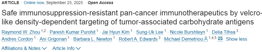 Raymond W. Zhou et al, Safe immunosuppression-resistant pan-cancer immunotherapeutics by velcro-like density-dependent targeting of tumor-associated carbohydrate antigens, Cell (2025). DOI: 10.1016/j.cell.2025.09.001.